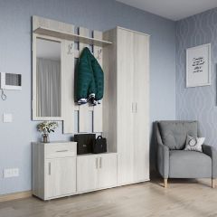 Состоит из: шкафа с выдвижной штангой, вешалки с крючками для одежды и сумок, обувницы, открытых полок, зеркала, полки для головных уборов, выдвижного ящика. Сборка универсальная, рисунок на фасадах не универсальный. На прихожей в цвете белый рамух нет рисунка.