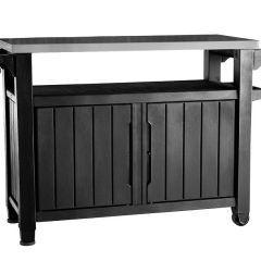 Функциональное и оригинальное решение в прекрасном стиле, такое как стол для гриля, украсит любой сад или террасу. Основным преимуществом продукта является его мультифункциональность. Необычная конструкция позволяет использовать его, как стол для приготовления блюд, и как шкафчик для хранения различных продуктов и ингредиентов. Столик оснащен столешницей из нержавеющей стали, удобной ручкой с дополнительными вешалками и колесиками, благодаря которым продукт удобно перемещать в разные места. Во вместительный шкафчик можно положить подручные аксессуары, необходимые для приготовления и подачи блюд на свежем воздухе.